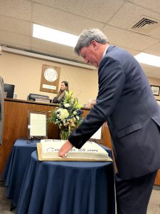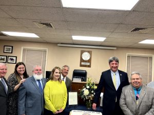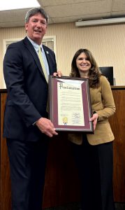 Noting it has been called the “Pearl of the Toms River,” the Ocean County Board of Commissioners recognized the small borough overlooking the southern bank of the Toms River on its 100th birthday March 25. In presenting a proclamation to Pine Beach Mayor Lawrence W. Cuneo, Ocean County Commissioner Jennifier Bacchione extended congratulations from the Board to the Borough and its residents for its outstanding contributions to Ocean County over the past century and wishing the community success in the years and decades to come. The Ocean County Board of Commissioners proclamation states the Borough of Pine Beach boasts a rich and proud history where residents hold fast to ongoing traditions to beautify and enhance their community. In addition to recognizing the Mayor and Council, Ocean County also acknowledged the Pine Beach Preservation Society for its work on the anniversary events.