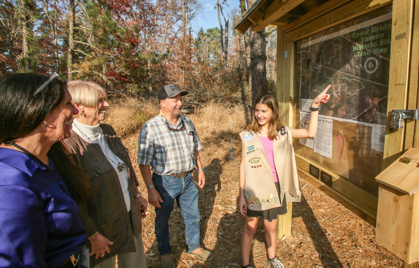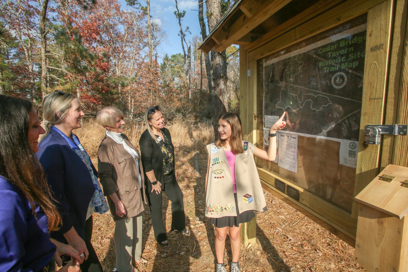 The Ocean County Board of Commissioners recently recognized Sarah Mangum, from Barnegat Township, as she pursues her Silver Award in Girl Scouting. Sarah, an eighth grader, who has an interest in becoming an architect decided to draw from that possible profession and create a kiosk from start to finish that now stands at the trail head of the County’s Cedar Bridge Tavern Historic Site in Barnegat Township. The kiosk contains important safety and park information and will assist visitors well into the future. Sarah tapped into the skills of her friends and family as her volunteer team and with the assistance of Ocean County Parks and Recreation staff, capably completed the project in the 50 hour time frame provided by the Girl Scouts of the USA. Sarah was recently joined at the site of the kiosk by Ocean County Commissioner Virginia E. Haines, Chairwoman of the Ocean County Department of Parks and Recreation, department staff, her parents and family members as she was recognized by the Board of Commissioners for her accomplishment. Haines noted that preserving the history of Ocean County is a priority of the Board of Commissioners. “Your successful efforts in designing, building, and installing an informational kiosk for the trail head at Cedar Bridge Tavern, rumored to be the site of the last skirmish of the American Revolution on Dec. 27, 1782, will help educate visitors of the significance of the area,” she said. “We recognize your dedication and your outstanding work in order to achieve this top ranking in scouting. Your leadership and your service to the community have enduring value. Your efforts are helping to make Ocean County a better place.” In addition to being an honor student at the Brackman Middle School, Sarah has also volunteered at Ocean County Parks and Recreation events. She has participated in Wreaths across America and is a member of the Children of the American Revolution where she has served as chaplain.
