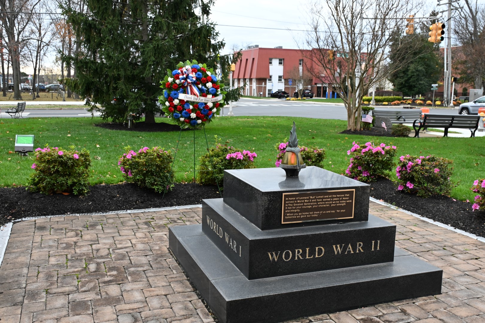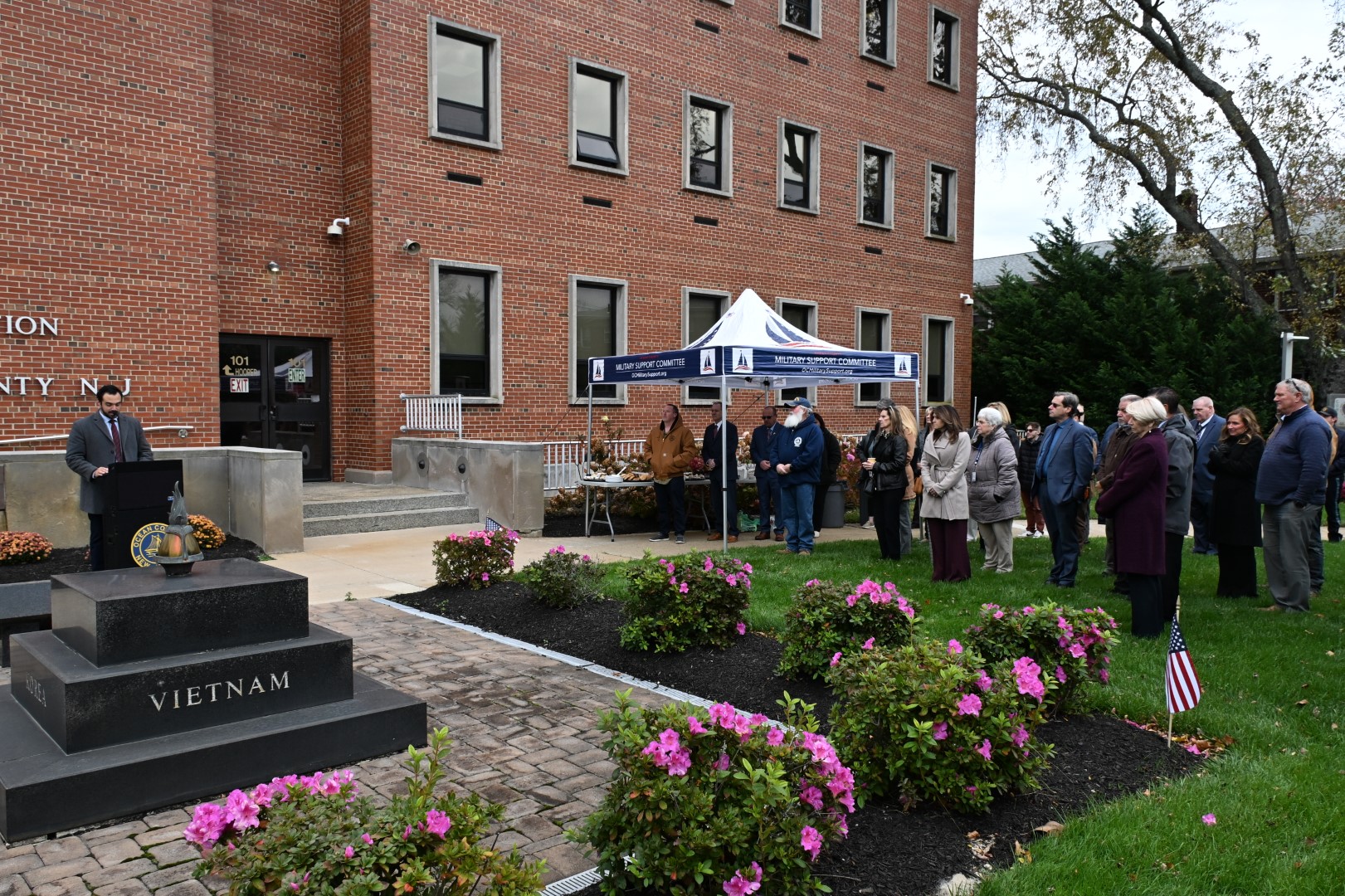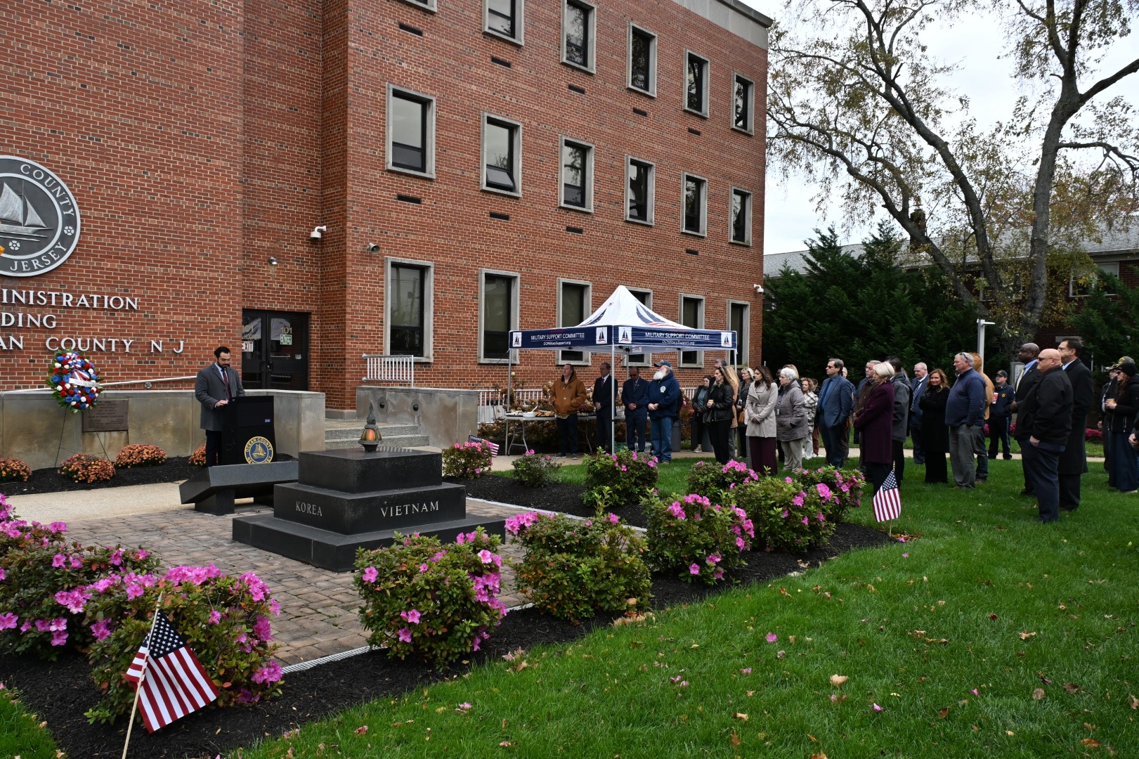Commissioners Jennifier Bacchione, Virginia E. Haines, and Deputy Director Frank Sadeghi joined Commissioner Arace, Veterans Service Bureau Director Vincent Camporeale, and Prosecutor Bradley Billhimer in paying tribute to veterans. The ceremony included the reading of a certificate of appreciation and the placement of a wreath at the Veterans Monument.