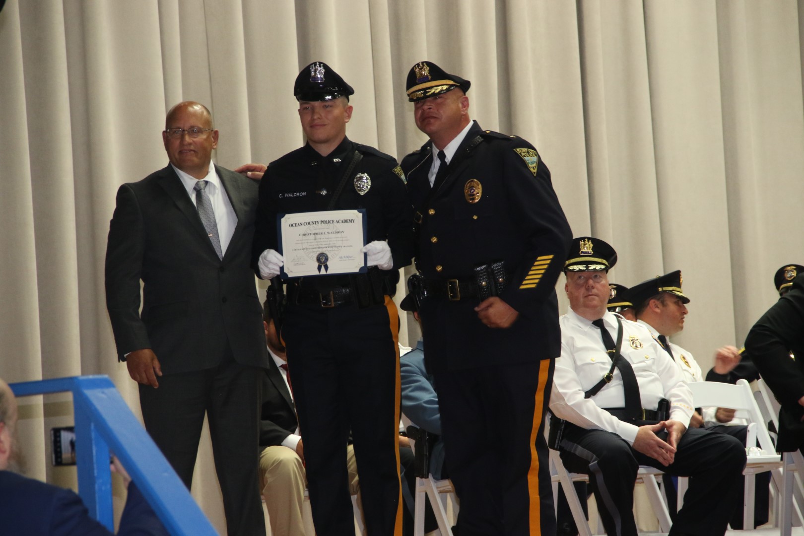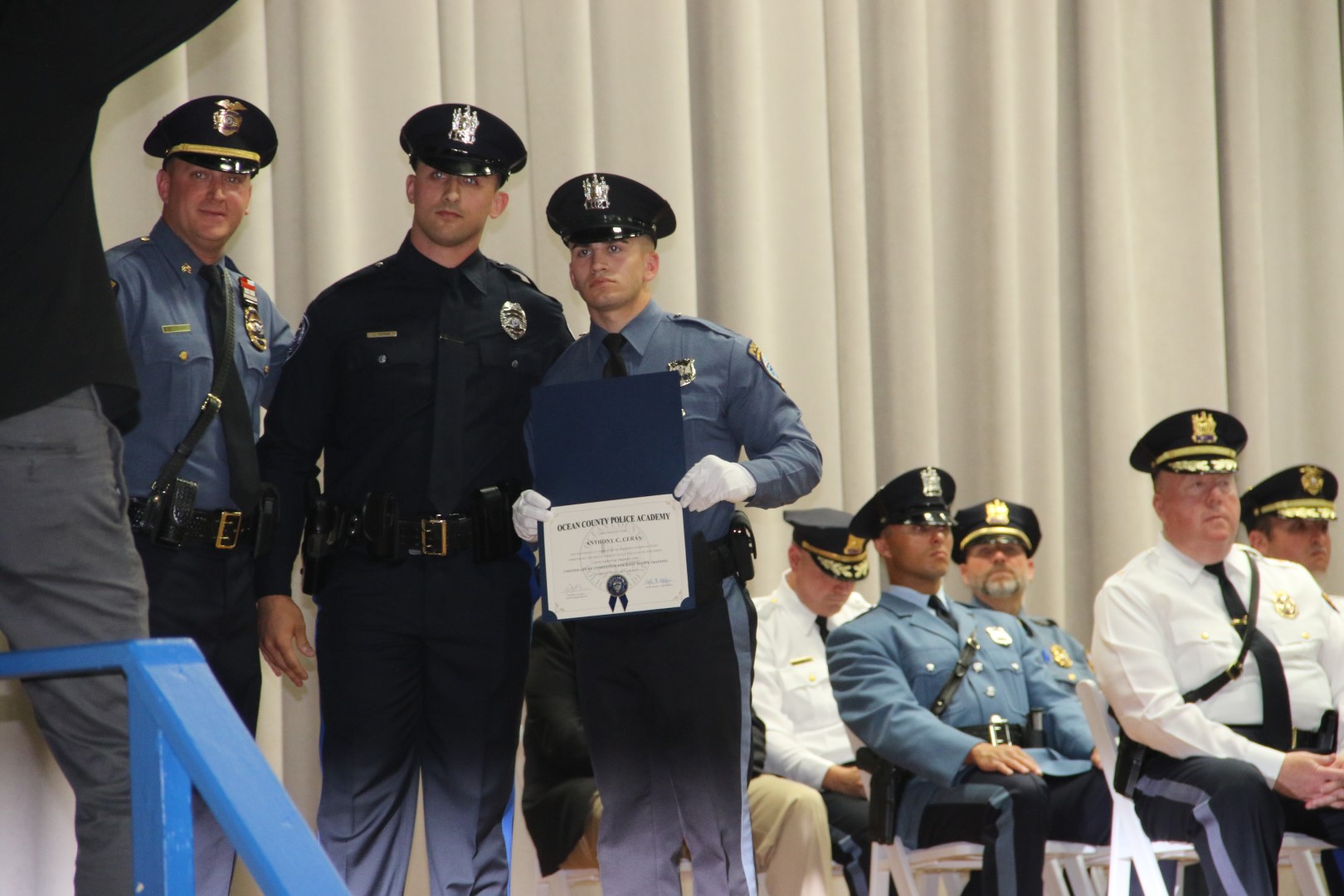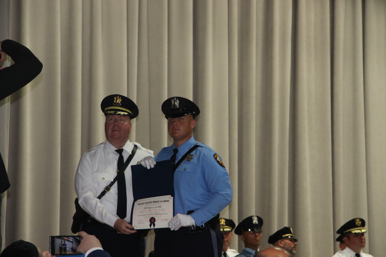 Ocean County Police Academy Basic Police Recruit Class No. 117 was recognized on June 7 during a graduation ceremony at Georgian Court University, Lakewood, following the successful completion of five months of intensive training at the academy which is led by Ocean County Sheriff Michael G. Mastronardy. The recruits were joined by family members and loved ones, their academy instructors and a host of law enforcement leaders and county Commissioners during the ceremony. “With the help of your very capable leaders and training instructors you achieved what for many is just a passing thought,” said Deputy Director of the Ocean County Board of Commissioners Gary Quinn, in addressing the class. “You have successfully completed your initial training and today we celebrate your accomplishments.” Three of the recruits – Jessica A. Campana, Jason P. Glass, Alexander C. Maj – will be joining the Ocean County Sheriff’s Department. Police Academy Instructor Surf City Police Department Sgt. Sarah Roe also was recognized for her dedication to the training at the Academy. Class award winners were: Alexander Maj, Ocean County Sheriff’s Department, the James J. Tracey Leadership Award; John A. Chelston, Joseph E. Ramirez, Maddox A. Samaritano, all Point Pleasant Beach Police Department, PTC Merit Award Winners; Kenneth J. Fortino, Point Pleasant Beach Police Department, High Overall Award; Nicholas C. Florio, Lakewood Police Department, High Academic Award and Class Valedictorian; Jack P. Coppolino, Seaside Heights Police Department, High Physical Fitness Award; Corey R. Maliff, Lakewood Police Department, High Marksmanship Award; and John A. Chelston, Anthony S. Concepcion, Sean M. Ferguson, Corey R. Maliff, Evan G. Ross, Daniel Wu, all Perfect Score Award. The following is a list of the graduating recruits and their respective police departments: Ryan J. Anderson, Joseph A. Stokes, both Asbury Park Police Department; Cory G. Azambuja, Anthony C. Ceras, John A. Chelston, Anthony S. Concepcion, Jack P. Coppolino, Brayden D. Curry, Dean G. DeFalco, John J. Forbey, Kenneth J. Fortino, Mark C. Ladzinski Jr., Joseph E. Ramirez, Maddox A. Samaritano and Daniel Wu, all Point Pleasant Beach Police Department; Jessica A. Campana, Jason P. Glass, and Alexander C. Maj, all Ocean County Sheriff’s Department; Robert K. Christian, Dylan A. DaCunha, Eddie De La Fuente, Sean M. Ferguson, Matthew Gatto and Evan D. Gisinger, all Seaside Park Police Department; Nicholas C. Florio, Corey R. Maliff and Nicholas S. Meyer, all Lakewood Police Department; Michael L. Madera and Donald D. Woit, Lavallette Police Department; Tyler J. Powasnick, Evan G. Ross and Nicholas S. Zbikowski, all Seaside Heights Police Department, and Christopher J. Waldron, Surf City Police Department.