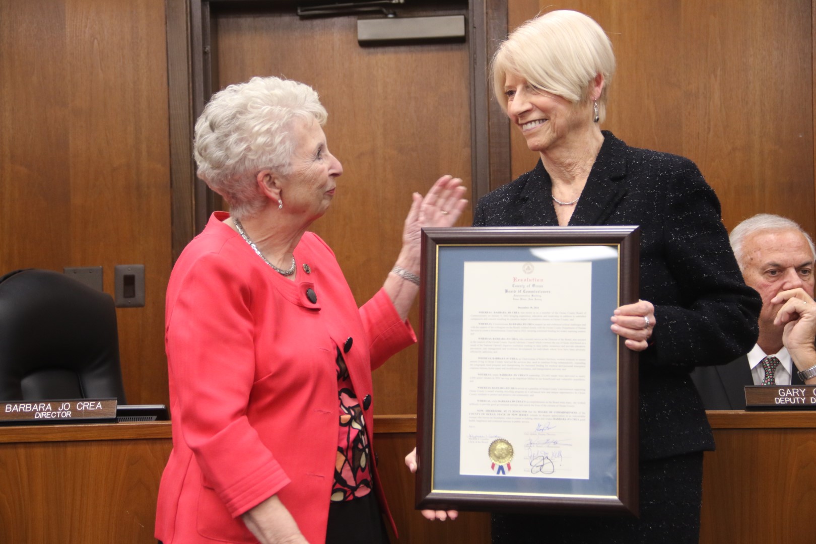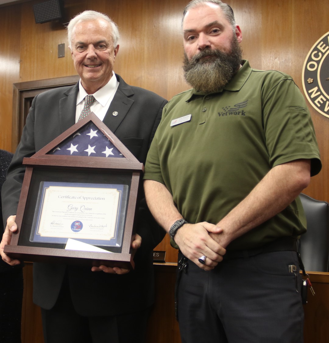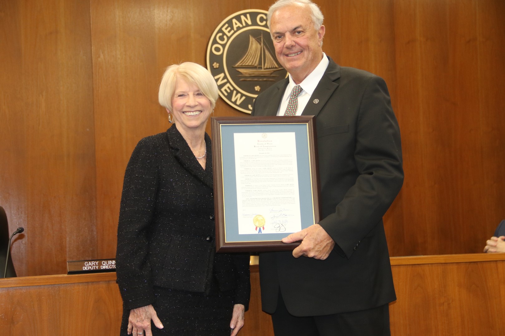 The Ocean County Board of Commissioners extends its appreciation to Director of the Board of Commissioners Barbara Jo Crea and Deputy Director of the Board of Commissioners Gary Quinn for their unwavering public service to the citizens of Ocean County. Crea served on the Board for a one three year term and Quinn served on the Board for two terms. Both are leaving an indelible mark on Ocean County government having implemented new key programs and improved upon existing services, all benefitting the quality of life for Ocean County residents. They are wished good health and happiness as they embark on new journeys.